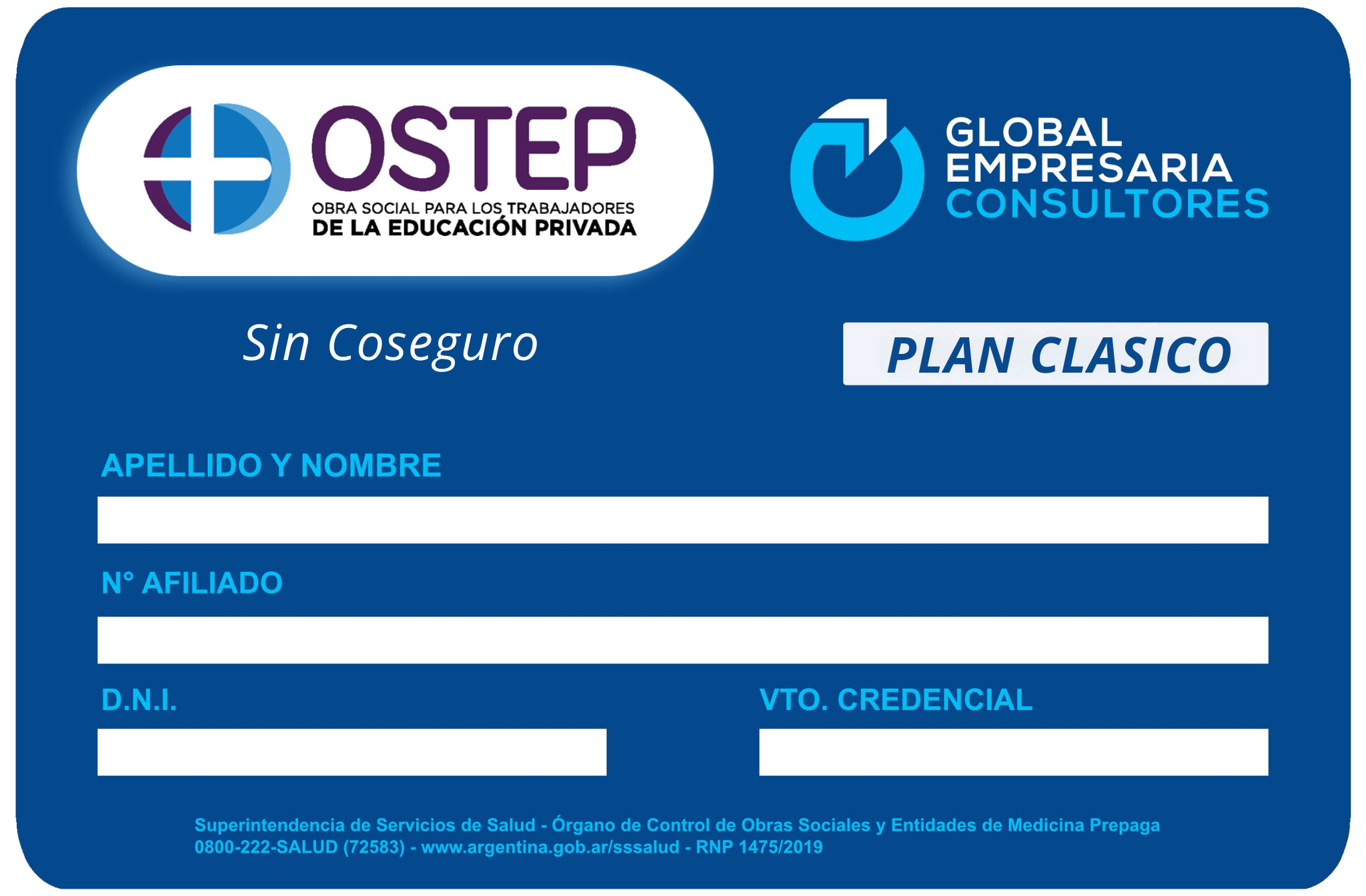La credencial virtual es la que se muestra en la imagen y dice OSTEP arriba a la derecha. Es la única autorizada para recibir los servicios y se accede a ella registrándose en la APP GLOBAL EMPRESARIA e ingresando con el dni y contraseña. En caso de tener inconvenientes con la misma, por favor comunicate con nosotros para que podamos gestionarte un certificado provisorio a la brevedad. Cada integrante de la familia debe tener su credencial.